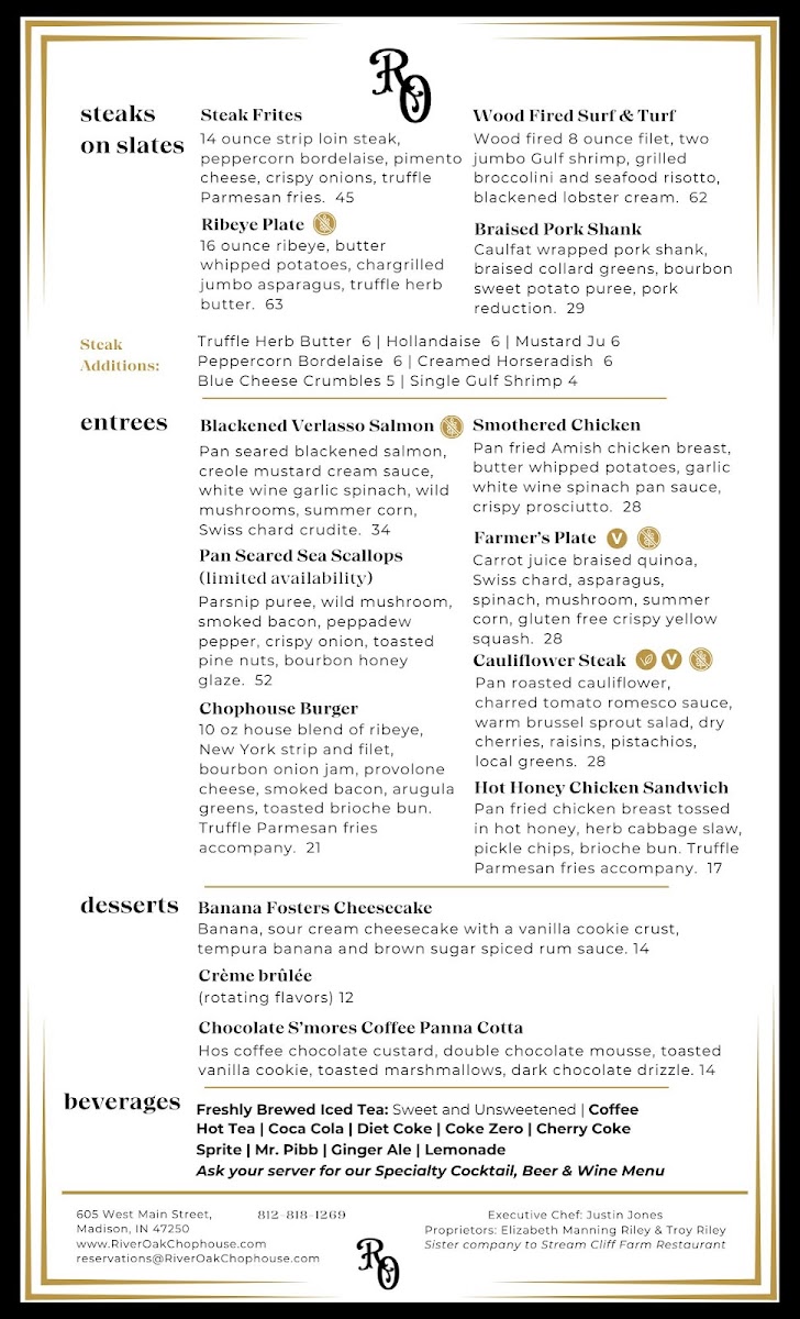 Welcome to River Oak Chophouse, a dining gem nestled in the heart of Madison, Indiana. Here, you're invited to indulge in a remarkable culinary experience characterized by top-notch service and exquisite flavors. The menu boasts a decadent selection of hand-cut steaks, each cooked to perfection, alongside a stellar array of sides such as Truffle Butter Crimini Mushrooms and Honey Bourbon Roasted Heirloom Carrots, all priced at an enticing US$6.00.